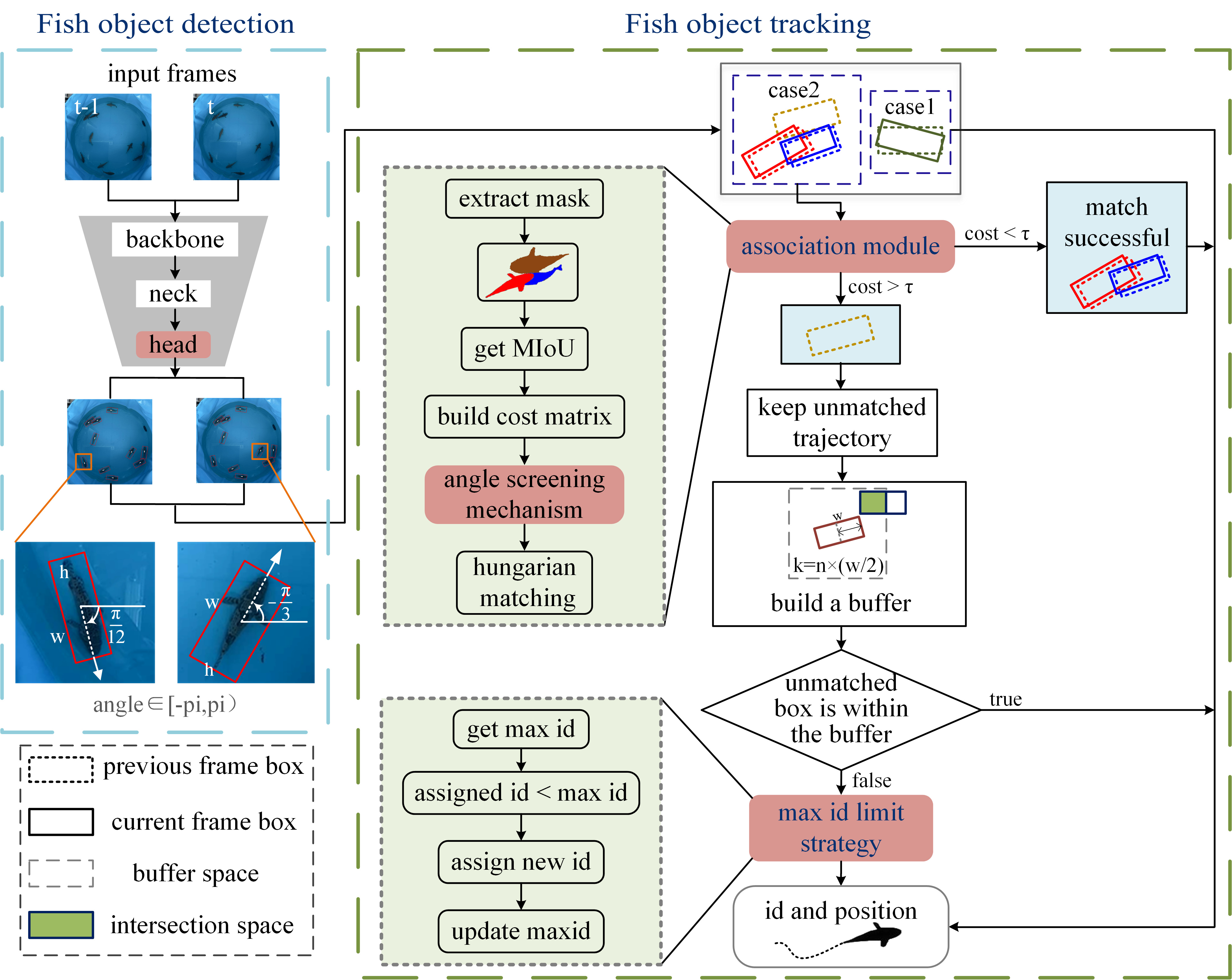 By partitioning the activity space from an overhead camera perspective, the proposed AOMO-FishTracker defines a unique forward orientation with oriented bounding boxes (OBB) and a lightweight angle regression branch for each fish during swimming.